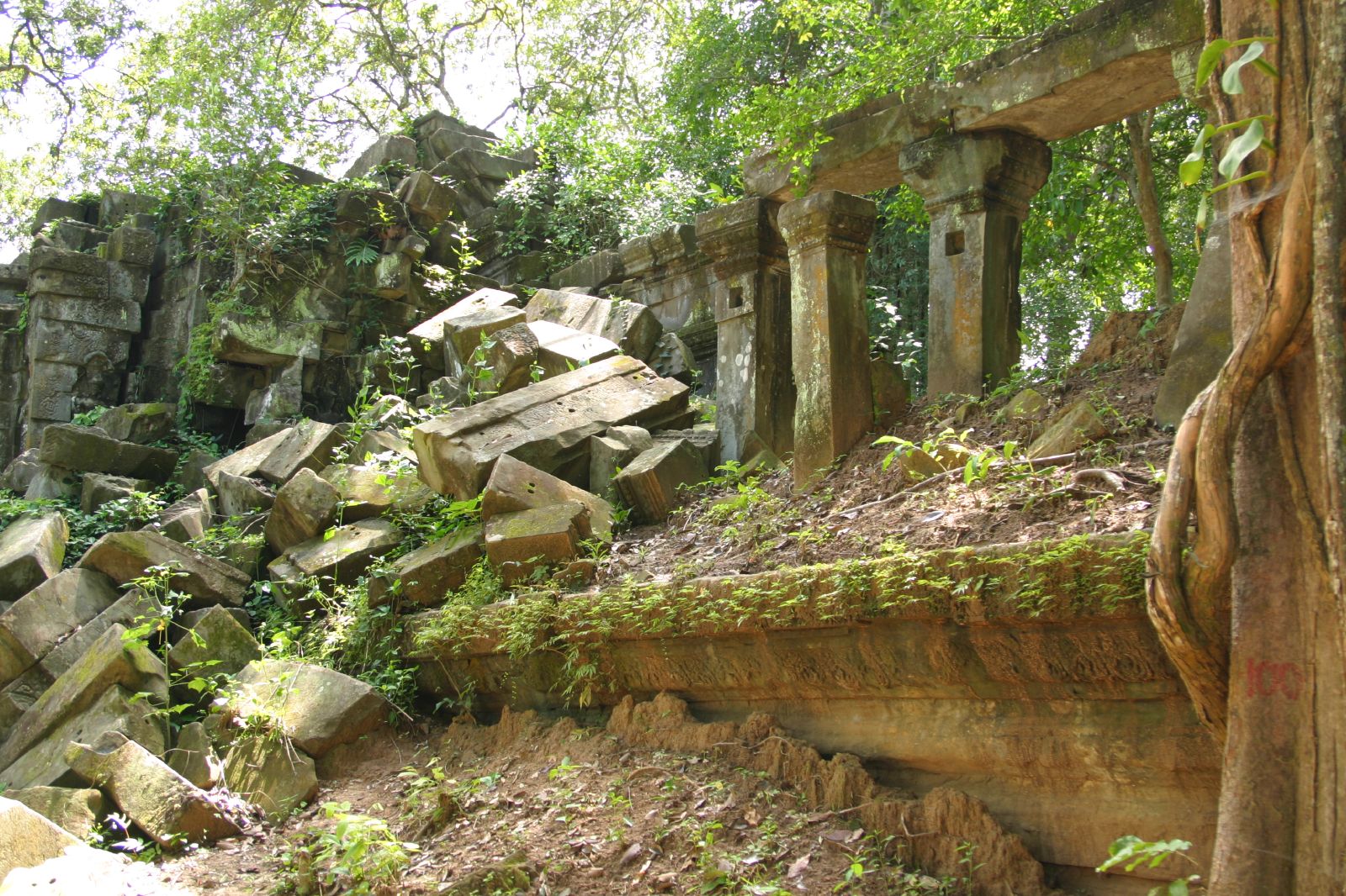 熱帯樹の茂る密林が遺跡全体を覆っていて、建造物のいたるところに熱帯樹が根を伸張し、挙句の果てに熱帯樹の倒壊に伴って建造物が無惨に倒壊してしまったという。